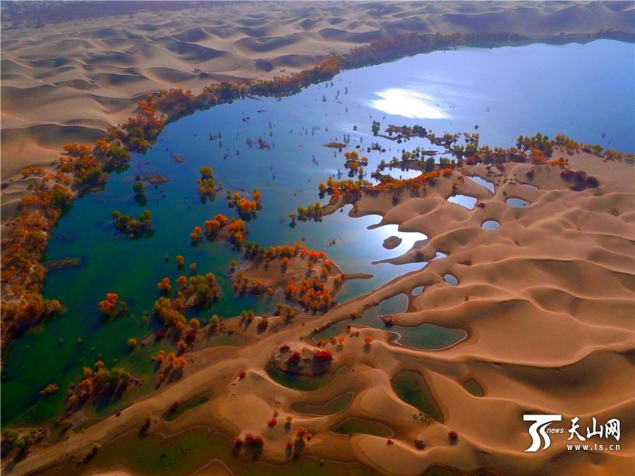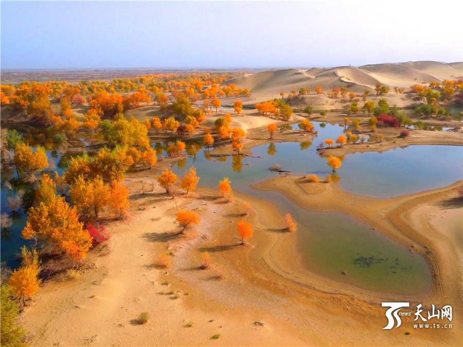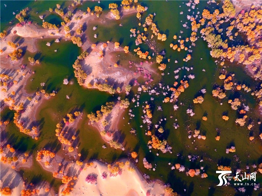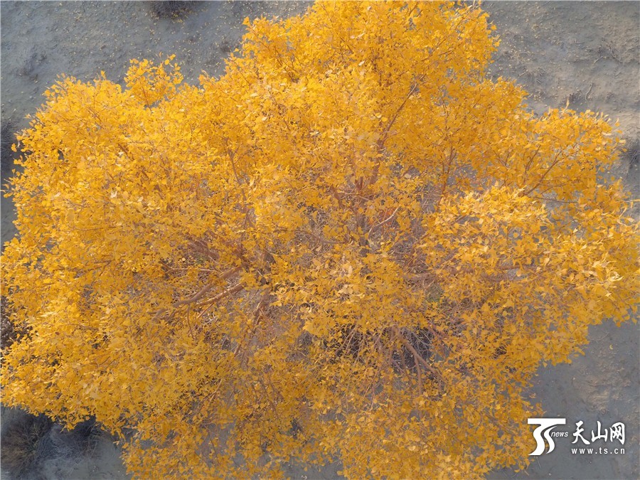 航拍下的胡杨金黄树叶色动人。