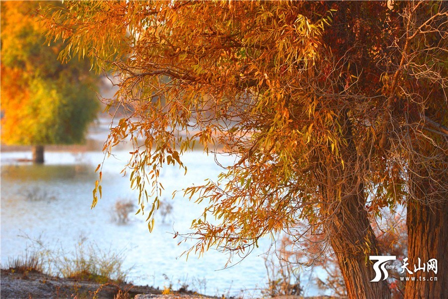 2016年11月2日,秋阳里婆娑起舞的胡杨树叶拥有鲜亮的色彩。