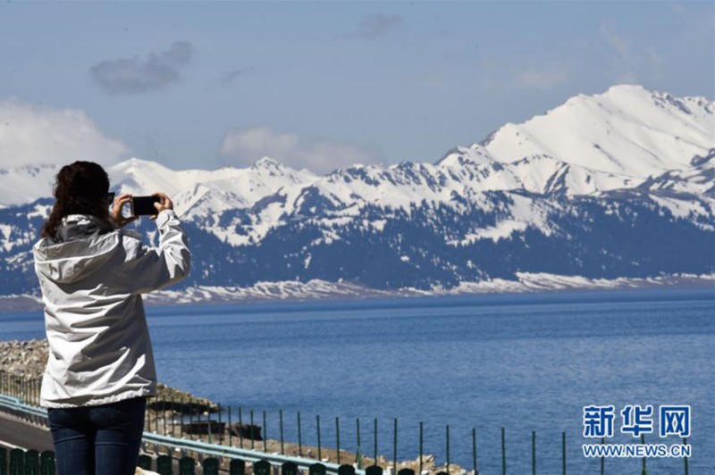 5月8日,一名游客在拍 摄赛里木湖。