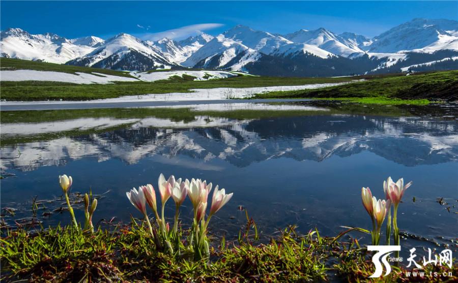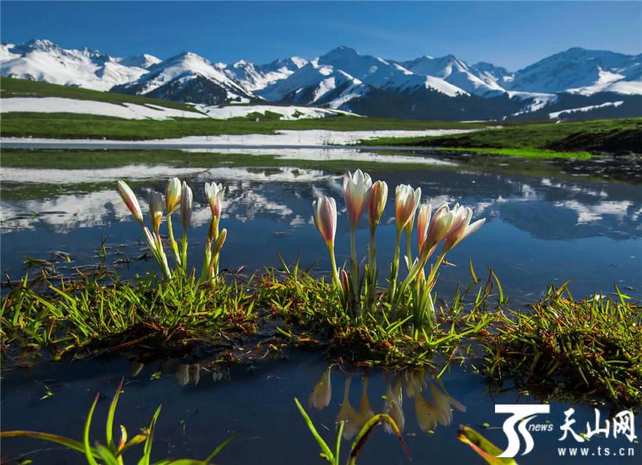 天山网讯(特约记者杨晓千摄影报道)进入四月,新疆“空中草原”那拉提生长着一片野百合。冰雪逐渐消融,野百合在涓涓雪水的滋养下悄然绽放。此花又名顶冰花、冰百合,因顶着冰雪开放而得名,是那拉提开放的第一朵花。雪山脚下一片野百合执着地盛幵,蔓延了整个草原山谷。空中草原名称的由来是和它的海拔有关系,草原平均海拔为2200米,由山下向上,随着地势的增高,气候、土壤、生物等自然条件都随之发生明显的变化,形成一条垂直景观带,是人们休闲避暑的好去处。