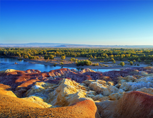 新疆的地形地貌可以概括为"三山夹两盆":北面是阿尔泰山,南面是昆仑山,天山横贯中部,把新疆分为南北两部分,习惯上称天山以南为南疆,天山以北为北疆。南疆的塔里木盆地面积53万平方公里,是中国最大的内陆盆地。位于塔里木盆地中部的塔克拉玛干沙漠,面积约33万平方公里,是中国最大、世界第二大流动沙漠。贯穿塔里木盆地的塔里木河长约2100公里,是中国最长的内陆河。北疆的准噶尔盆地面积约38万平方公里,是中国第二大盆地。准噶尔盆地中部的古尔班通古特沙漠面积约4.8万平方公里,是中国第二大沙漠。